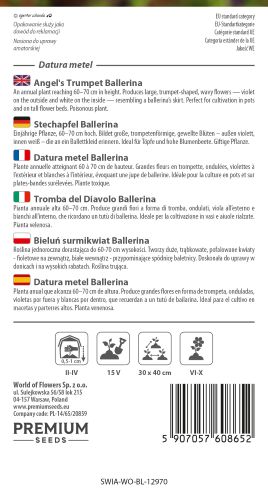 Water regularly during dry spells and feed every two weeks to support strong flowering. Remove spent blooms to encourage continuous production. Plants thrive in heat and sheltered sunny positions. Handle with care and avoid ingestion as all parts of Datura are toxic.