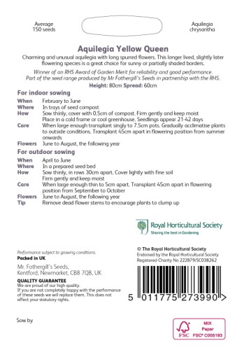 Awarded the Royal Horticultural Society's Award of Garden Merit (AGM) for its excellent garden performance, Aquilegia Yellow Queen is part of the RHS Seed Scheme, ensuring high-quality seeds that are ideal for gardeners seeking reliable and rewarding results.