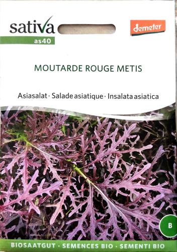 Moutarde Rouge Métis (Brassica juncea) is a striking Asian mustard variety with deep burgundy, serrated leaves and a bold, peppery flavour.