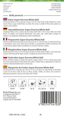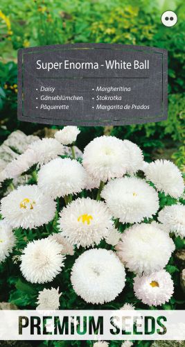 A pristine and elegant English daisy with fully double button blooms in pure white. Daisy Super Enorma White Ball forms neat low growing clumps of spoon shaped green foliage topped with profuse flowering stems. The blooms appear from late winter through spring and are highly attractive to bees and early pollinators.