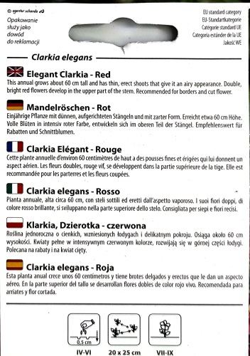 Sow seeds thinly where plants are to flower once soil is warm and frost risk has passed. Lightly cover with soil and water gently. For earlier blooms, sow indoors in trays or modules and transplant after hardening off. Space plants 20 to 30 cm apart. Clarkia prefers not to be disturbed once established.
