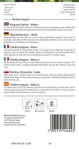 Elegant Clarkia White forms upright branching plants with slender stems and narrow green foliage, producing a profusion of crisp flowers from early to late summer. Its airy habit and clean colouring make it ideal for cottage gardens, borders, and informal floral displays.