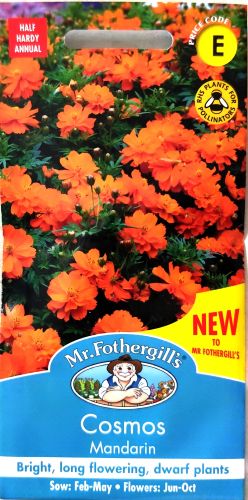 Cosmos Mandarin is a half-hardy annual that produces masses of daisy-like flowers in vivid orange with golden-yellow centres. Its finely divided foliage and upright habit make it a striking choice for summer bedding, wildlife gardens, and cut flower arrangements. Unlike taller cosmos, this variety is more compact and bushy, making it suitable for smaller gardens and patio pots. Heat- and drought-tolerant once established, it flowers continuously from midsummer to early autumn, attracting bees, butterflies, and other pollinators.