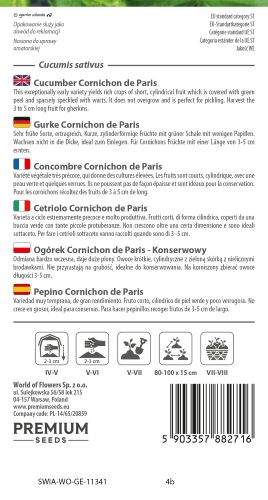 It is prized for producing large numbers of small crisp cucumbers, ideal for making authentic French cornichons. The fruits are short and cylindrical, with smooth green skin and a firm crunchy texture.