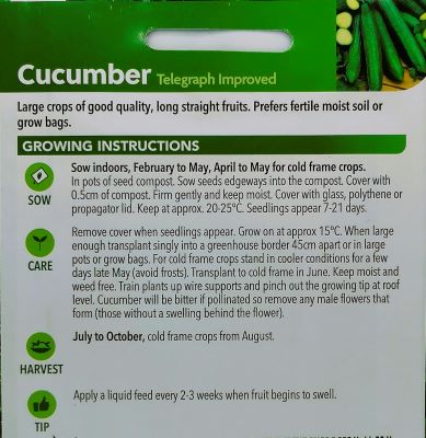 Growing to a height of 30-45 cm, with a spread of 90-120 cm, Cucumber Telegraph Improved thrives in warm, sunny conditions and well-drained, fertile soil. This variety produces long, uniform cucumbers, typically around 30-40 cm in length, over an extended harvesting period. The plant is known for its vigour, producing an abundant crop of crisp, tender fruit throughout the summer.