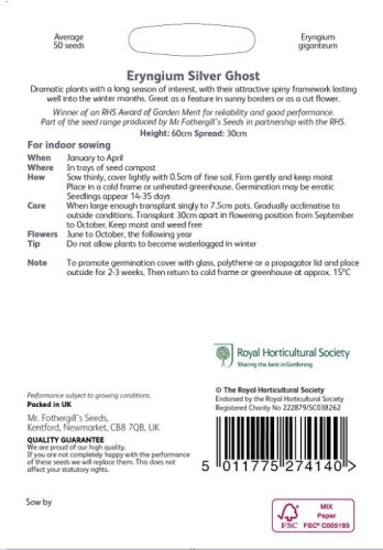 As part of the RHS Seed Scheme, Eryngium Silver Ghost ensures high-quality, reliable seeds that produce strong plants, perfect for gardeners looking to add some elegance and boldness to their garden.