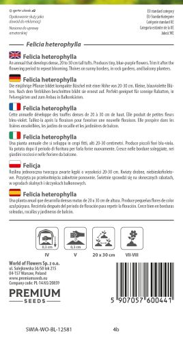 Sow seeds on the surface of moist compost and press lightly without covering, as light aids germination. Keep at 18 to 20°C until seedlings appear. Transplant into individual pots when large enough to handle. Harden off and plant outdoors after the last frost. Space plants 25 to 30 cm apart. Felicia prefers minimal root disturbance and benefits from early sowing.