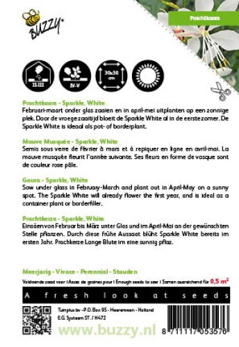 Sow February to April indoors or directly outdoors from May. Germination 14 to 21 days at 18 to 22°C. Soil and Position Light well drained soil; prefers full sun. Height 60 to 90 cm with upright stems and white butterfly like flowers. Flowering June to October.