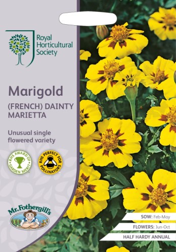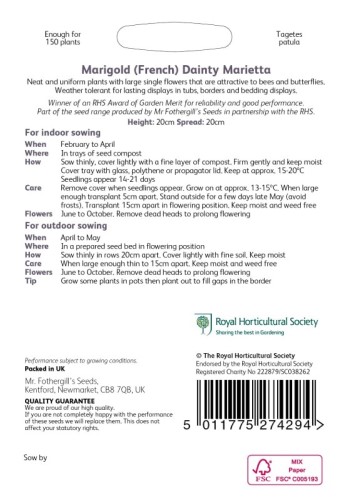 With its lovely small flowers and compact form, Marigold French Dainty Marietta is an excellent choice for adding lively colour to any garden. Whether in containers, borders, or hanging baskets, this RHS-endorsed variety will brighten up your space from summer to autumn.