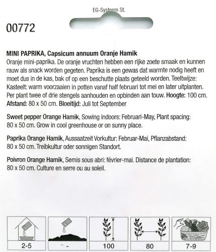 A compact plant that produces almost seedless very sweet orange snacking peppers that measure around 7cm long.