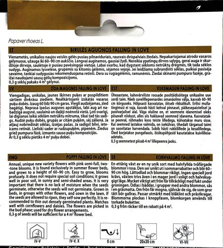 Poppy Falling in Love (Papaver rhoeas L.) is a breathtaking variety that produces a romantic blend of semi-double and double blooms in shades of pink, rose, and soft red, often with delicate picotee edges. Each flower is unique, creating a stunning patchwork of colour that brings charm and elegance to any garden.
