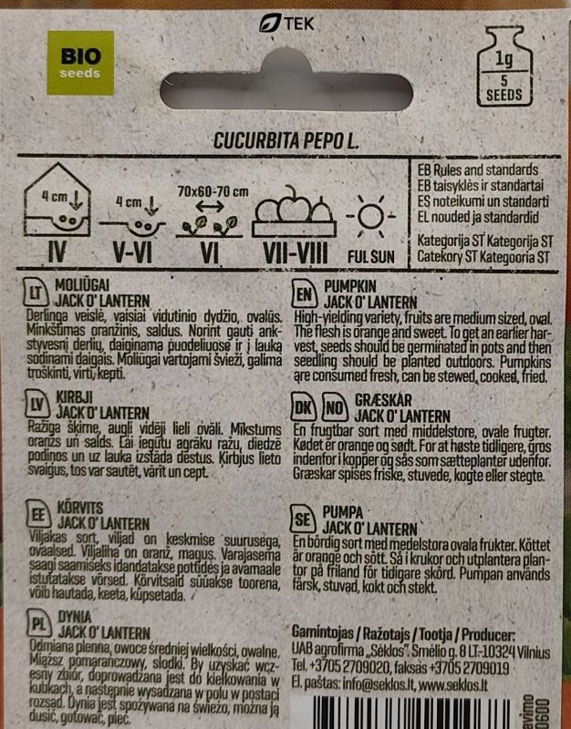 Certified Organic Seeds. Original sealed packet from Seklos. Certified under LT EKO 001 (Ekoagros).