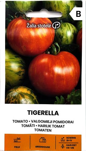 Tomato Tigerella (Solanum lycopersicum L.) is a striking and flavoursome variety, easily recognised by its bold red fruits adorned with unique golden-orange stripes.
